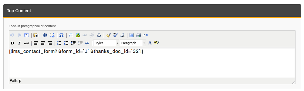 In the resource editor, the form will appear as an iMarket shortcode. iMarketStaff users should take care not to modify this content if/when editing the page.