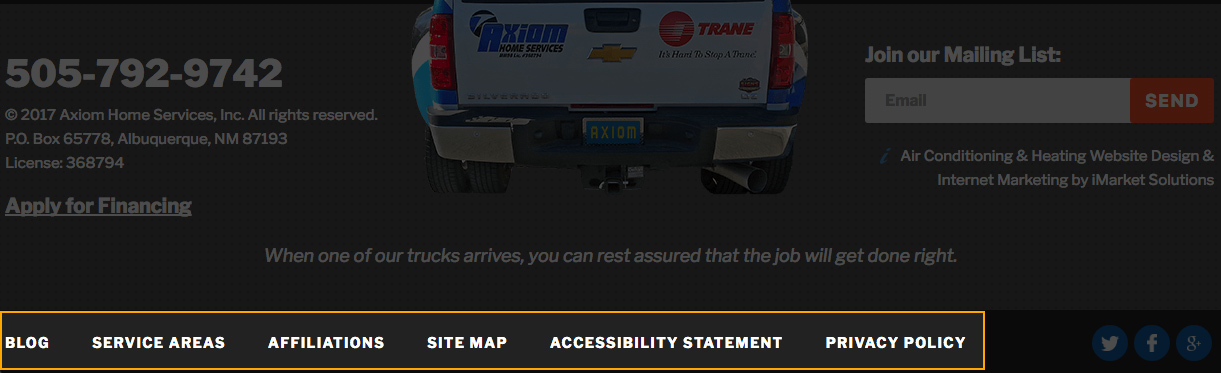 The Footer Menu displays in the footer of the site across all pages. Only top-level links are visible, and (except in the case of older iMarket sites), there are no subpage links.
