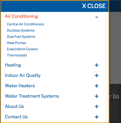 On mobile devices, the Header Menu will be hidden, and a menu icon will display. Tapping the menu icon will open the Header Menu. Again, only the top-level links are immediately visible. Tapping on the corresponding plus (+) sign will display the subpage links.