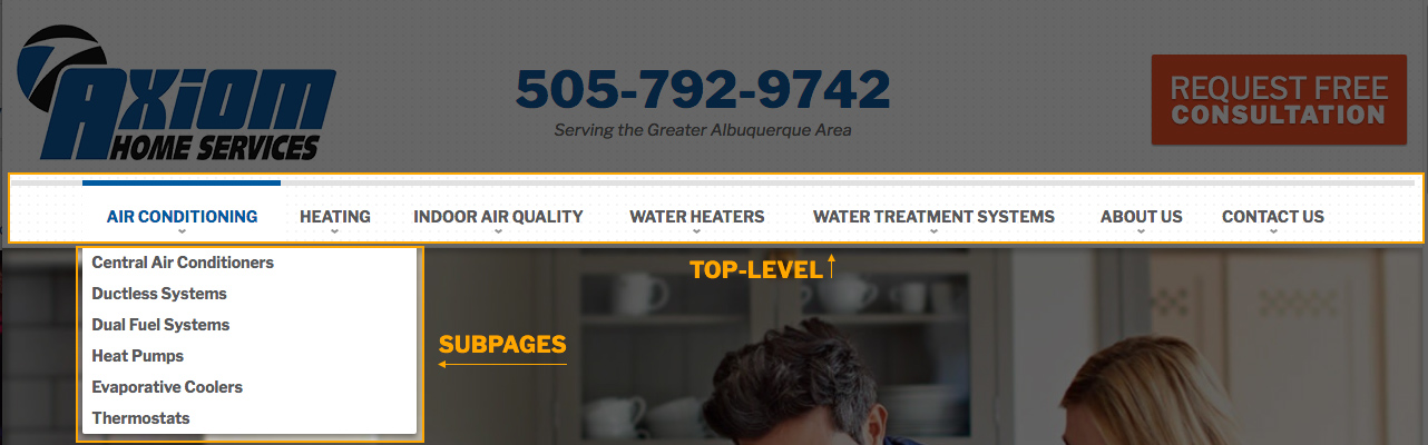 Only the Top-Level pages are immediately visible, but subpage links can be viewed by hovering over a menu item.