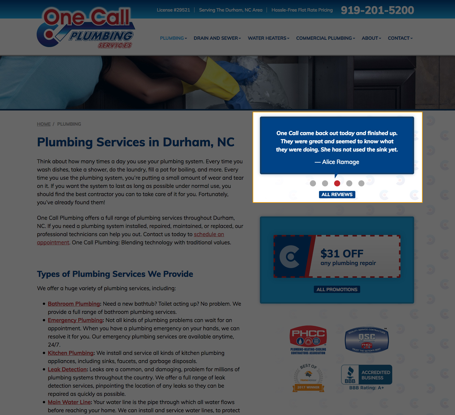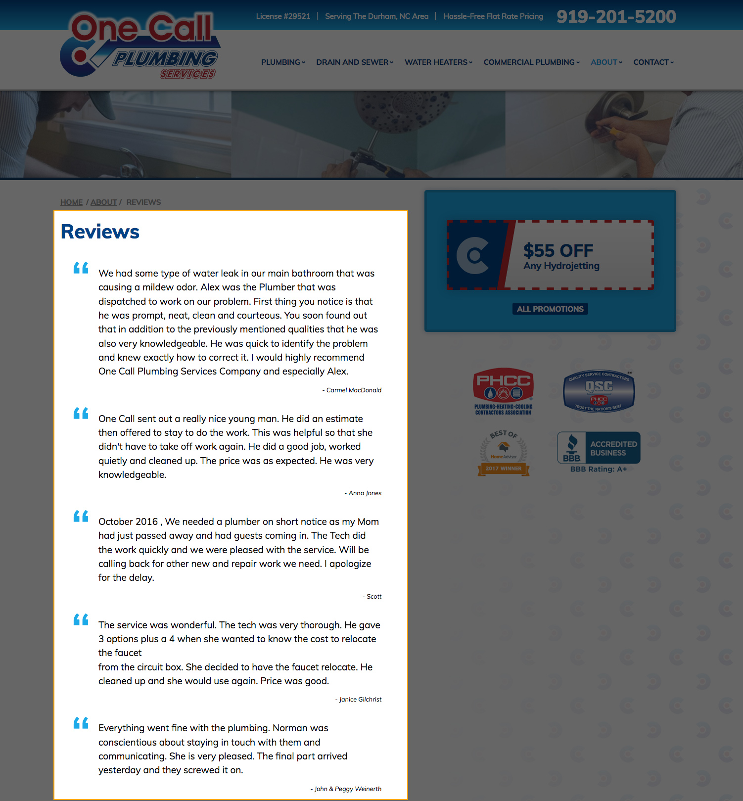 All websites include a Dedicated Reviews Page (unless removed by client request). The reviews page is typically found at http://www.yoursiteurl.com/about/reviews.