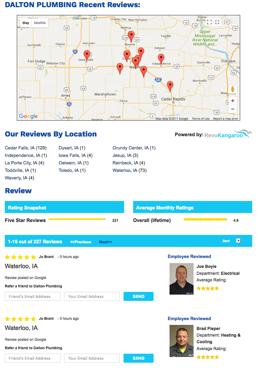 Clients may collect reviews from third party sources and request to display them on their site. In some cases, the tool is simply a logo with a link to the outside review aggregator. In other cases, the tool generates a listing of reviews on a particular page of the iMarket site (similar to Recommend Me). Two examples are shown below.