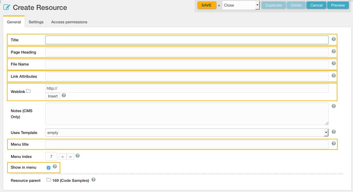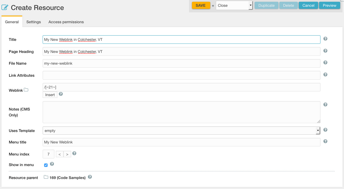 - Weblink: This is the resource the weblink will link to. In most cases, this will be an internal page (i.e., another page on the website). All internal links should be built using the ID of the resource, rather than by inputting the URL. For external links, you should enter in the full URL (ie: http://google.com).