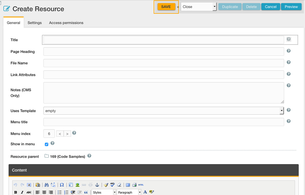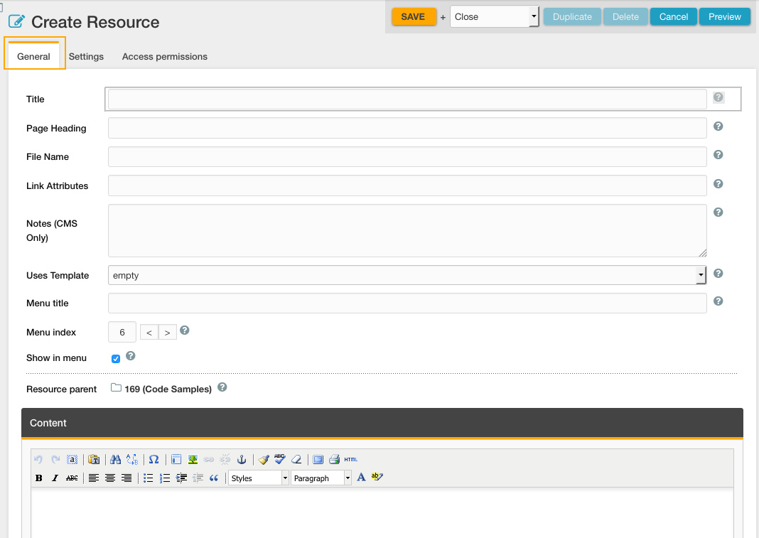 The page will load in the Main Content Area under the “General” tab. This is where you will enter in all of the information needed to complete the page. The available/required content areas are described in a separate section of this documentation.