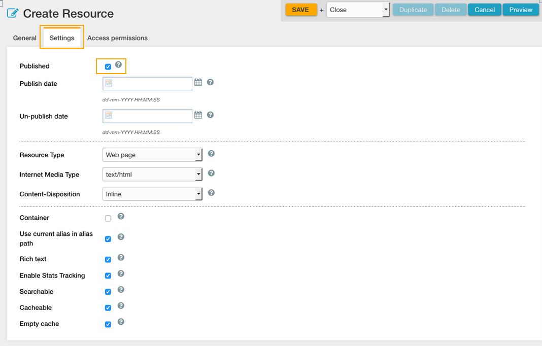 If you wish to leave a page unpublished, select the “Settings” tab and uncheck the “published” option.