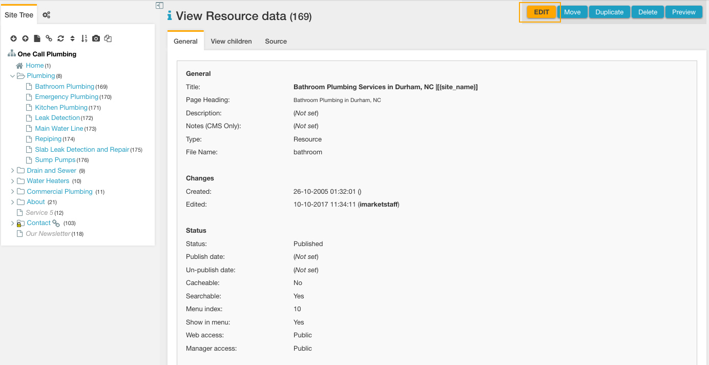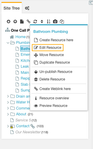 Alternatively, right click on the page name. A menu will appear, and you can choose “Edit Resource” from that menu.