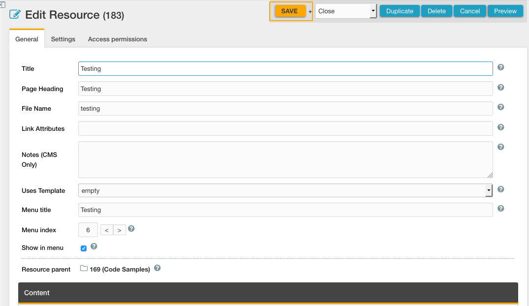 Once the page is opened for editing, you can change the document’s settings as well as editing the document’s content. When editing, we suggest that you edit the individual text needed rather than deleting all existing text prior to editing the page. You will not be able to edit module content (instead, edit the content through the corresponding module). If content is not available for editing, please open a ticket to Development to make the edit.