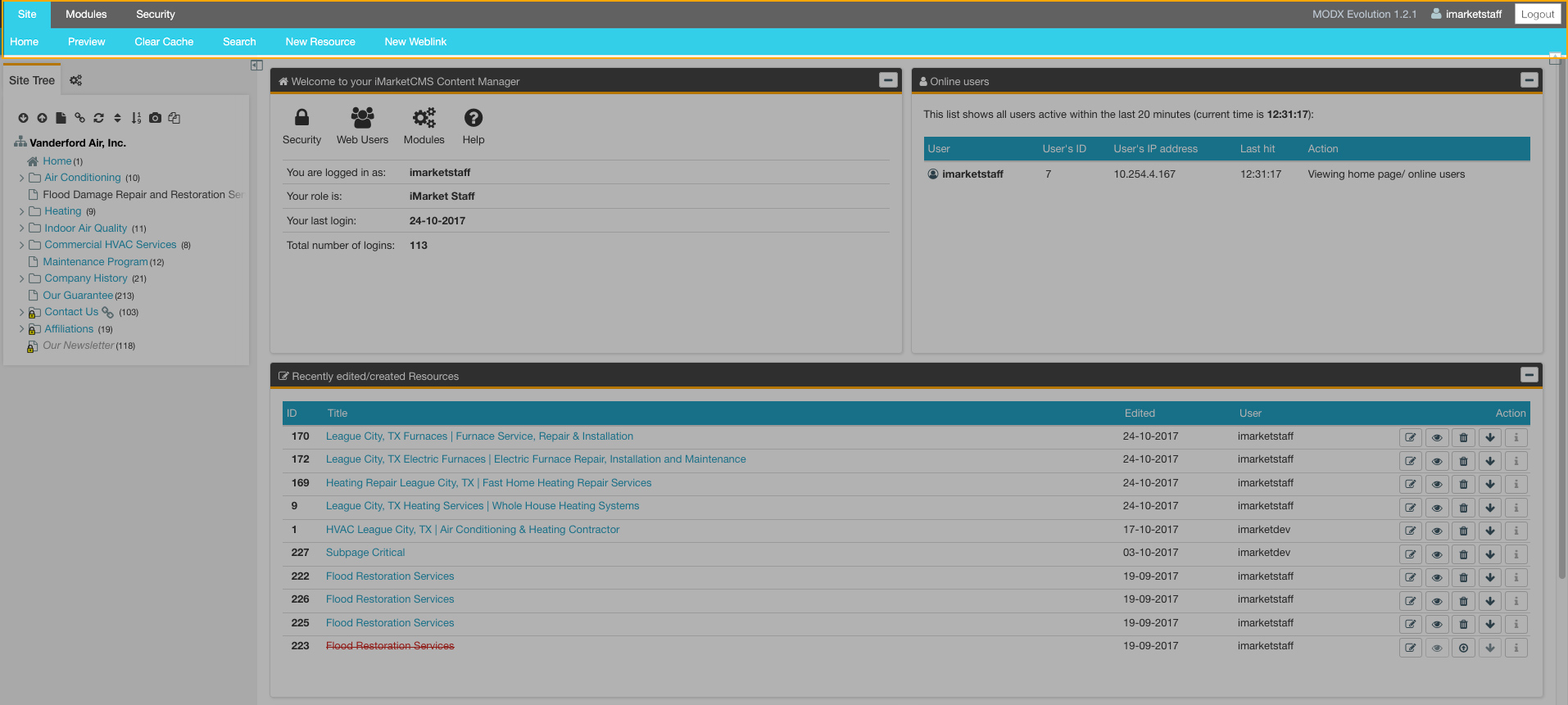 The iMarket CMS Manager is the interface used to make changes to a client website.