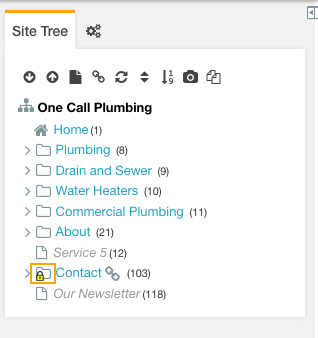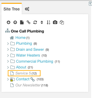 The Site Tree displays a list of all the resources (pages and weblinks) in the website. Clicking on a page in the resource list will make the page appear in the Main Content area for editing.