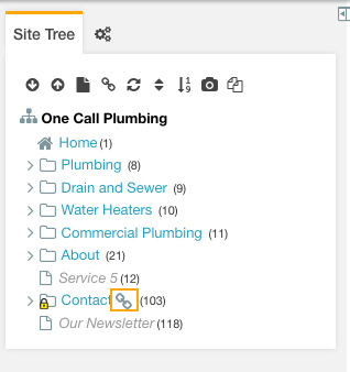 The Site Tree displays a list of all the resources (pages and weblinks) in the website. Clicking on a page in the resource list will make the page appear in the Main Content area for editing.