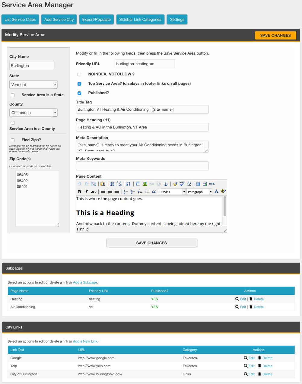 Use this module to add/edit/delete Service Areas and their respective landing pages.