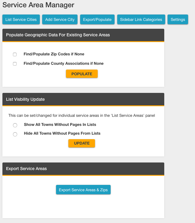Export/Populate: The export/populate tab allows you to automatically populate zip codes or counties if there are none assigned. This should be used with caution: The client may not service all zip codes in a particular city.