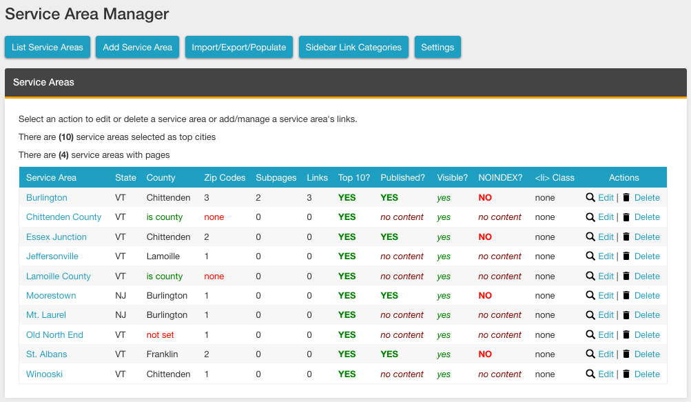 Export Service Areas: Use this button to export a spreadsheet with all the service area towns and their associated zips.