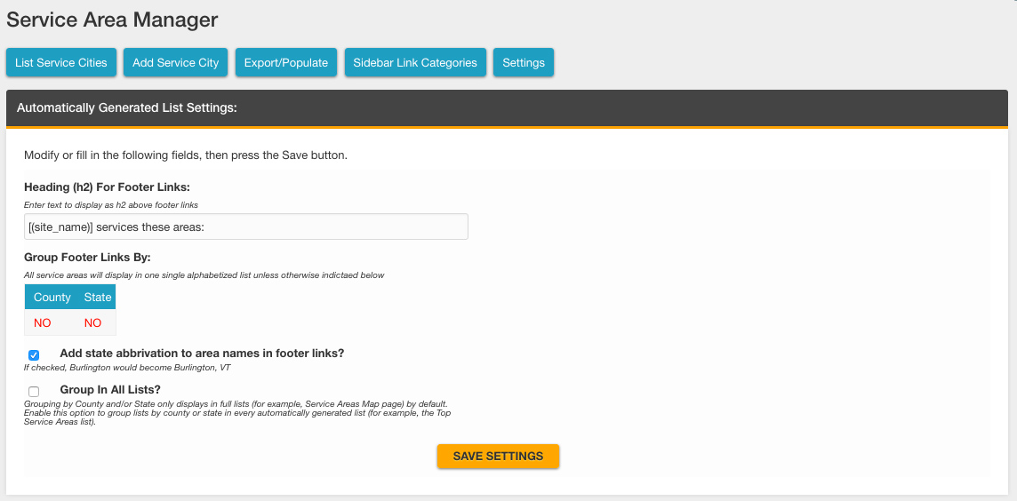Group in All Lists: By default, the “Group Footer Links By” option above only impacts full service area lists (in other words, the Service Areas Map page list). Checking this option will enable your above setting across all automatically generated lists (for example, the Service Area List Block).