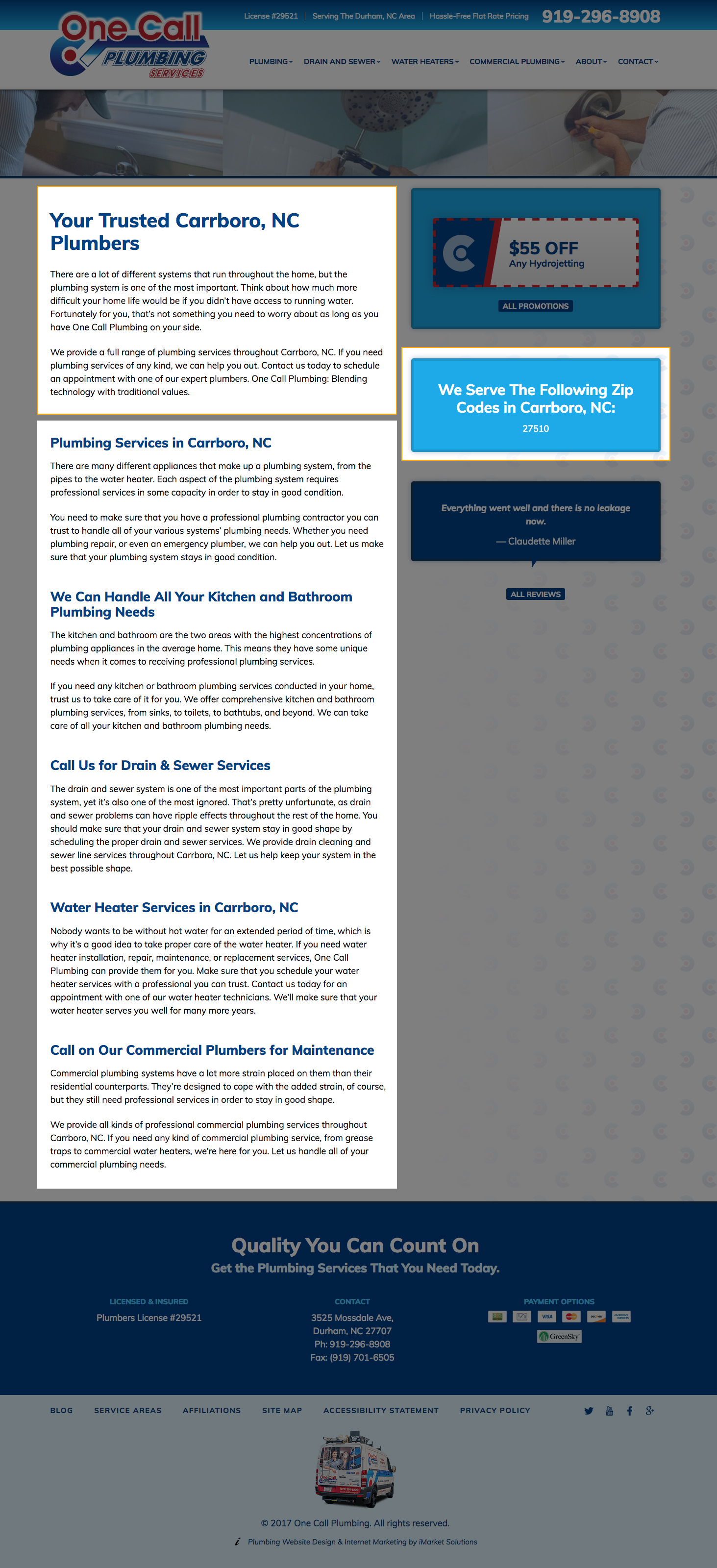 The sidebar may include promotions, testimonials or other blocks that also appear on the main content pages (this will be determined by the development and design of the website at the time of site build). An additional sidebar or full-width block will be included to display the list of zip codes serviced in the city being viewed. If blog posts are tagged with the city name, they will also appear in a sidebar or full-width block.